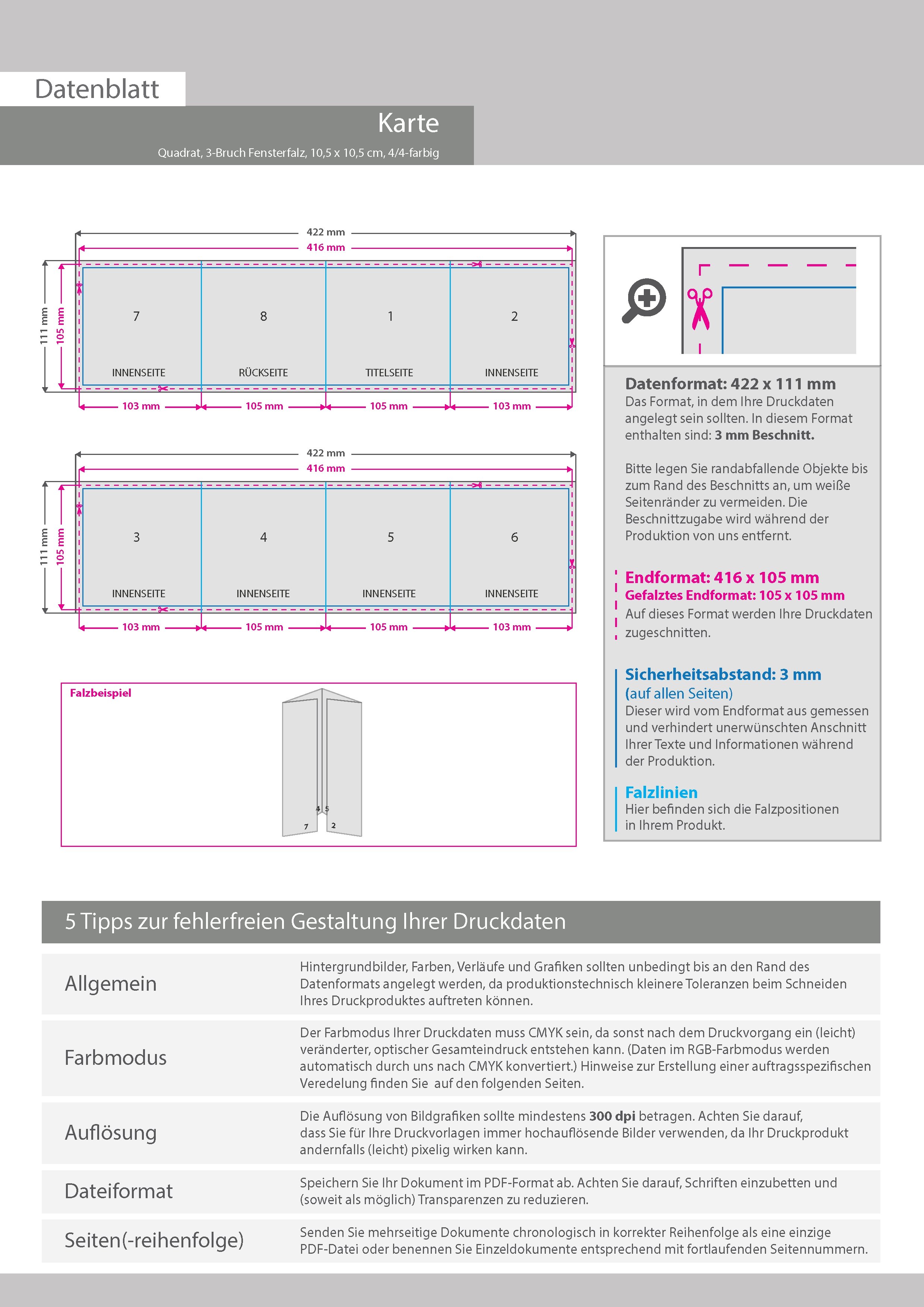 Einladungskarte, gefalzt auf Quadrat 10,5 cm x 10,5 cm, vertikaler 3-bruch Fensterfalz, 8-seitig